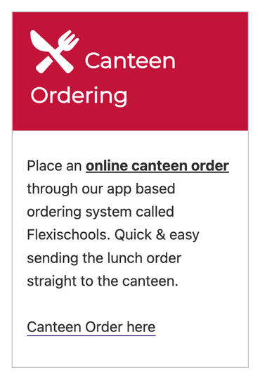 <h2>Online Canteen Orders</h2> <p>Canteen menu items can be pre-ordered and pre-paid online via our <a href="https://flexischools.com.au"><strong>canteen app</strong></a> for lunch pick up at the tuckshop. <a href="https://flexischools.com.au"> <strong>Online canteen orders</strong></a> can be placed in advance and changed anytime up to [7:00 am - insert your order cut off time] on the day of pickup.</p>