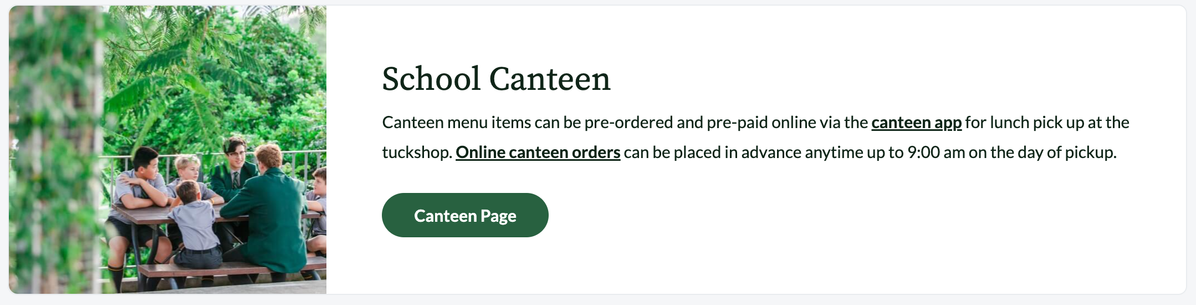 If it isn’t possible to add a tile to the homepage or create a new dedicate page for the canteen, our last recommendation is to include a link to https://flexischools.com.au/ in the page footer template at the bottom of each page.